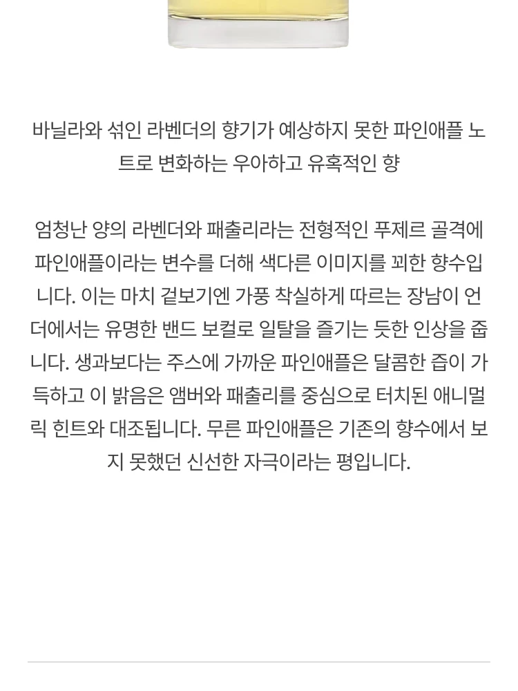 - 바닐라 섞인 라벤더의 향기가 예상하지 못한 파인애플 노트로 변화하는 우아하고 유혹적인 향