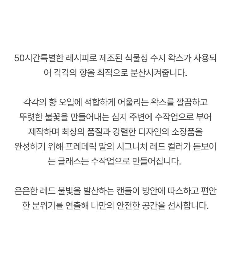 | 사용방법 | 캔들에 불을 붙여 시간이 지날 수록 향이 퍼지도록 하세요. 효과적인 발향을 위해 첫 사용 시 2~3시간 동안 태우세요. 각각의 캔들은 약 50시간 동안 태울 수 있습니다. |