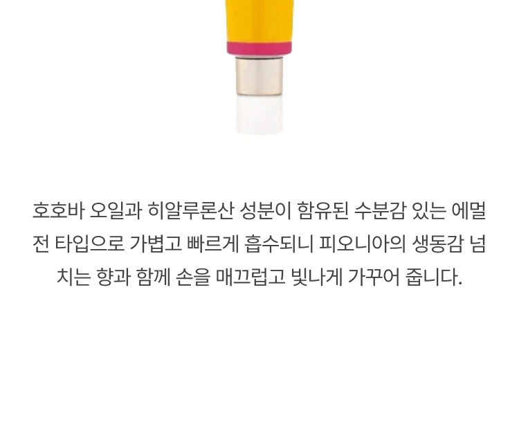 호호바 오일과 히알루론산 성분이 함유된 수분감 있는 에멀전 타입으로 가볍고 빠르게 흡수되니 피오니아의 생동감 넘치는 향과 함께 손을 매끄럽고 빛나게 가꾸어 줍니다.