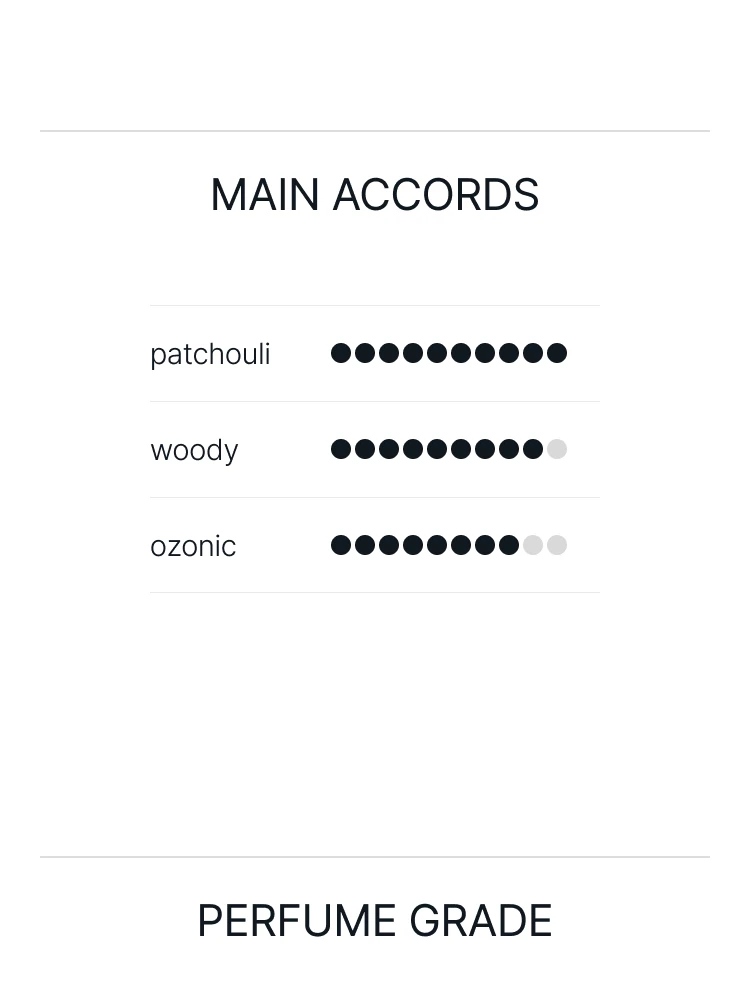 - 싱글 노트: 페출리, 주니퍼 베리, 그린 리프, 머스크, 암브록산