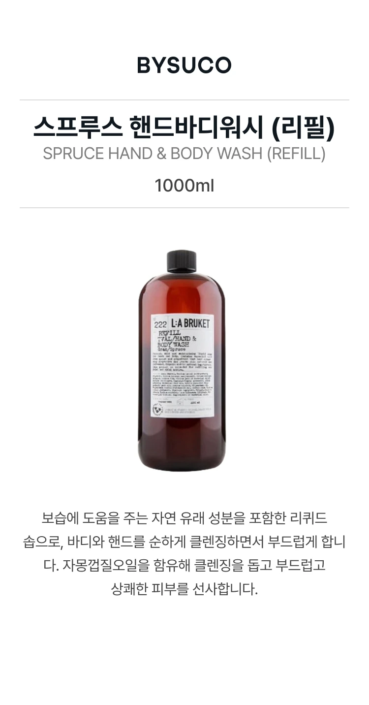 | 표시성분 | 정제수, 소듐라우릴설포아세테이트, 글리세린, 소듐라우로일사코시네이트, 코카미도프로필베타인, 소듐피씨에이, 향료(스프루스향 0.8%), 소듐레불리네이트, 카프릴릴/카프릴글루코사이드, 분비나무오일, 자몽껍질오일, 소듐아니세이트, 폴리솔베이트20, 광곽향오일, 시트릭애씨드, 소듐코코일글루타메이트, 글리세릴카프릴레이트, 폴리글리세릴-6올리에이트, 소듐서팩틴, 리모넨, 리날룰, 시트로넬올 |