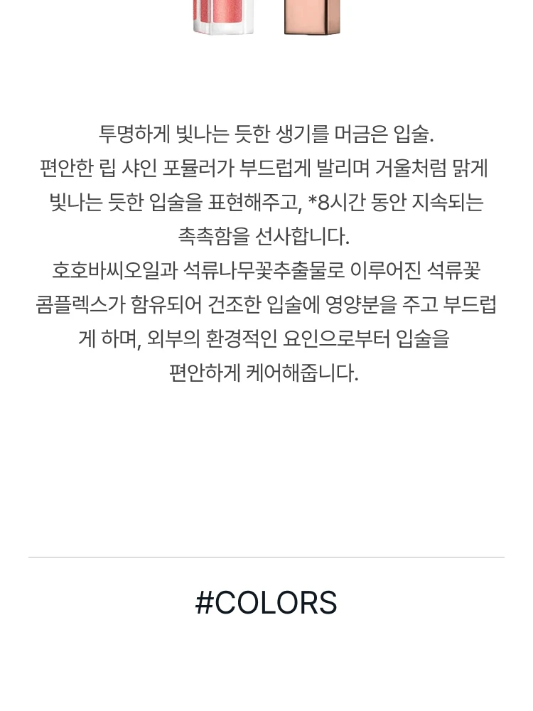 거울처럼 맑게 빛나는 듯한 표현과 8시간 동안 촉촉함이 지속되는 편안한 립 샤인 포뮬러.
