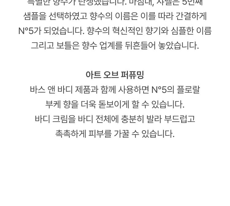 | 사용방법 | 바스 앤 바디 제품과 함께 사용하면 N°5의 플로랄 부케 향을 더욱 돋보이게 할 수 있습니다. 바디 크림을 바디 전체에 충분히 발라 부드럽고 촉촉하게 피부를 가꿀 수 있습니다. |