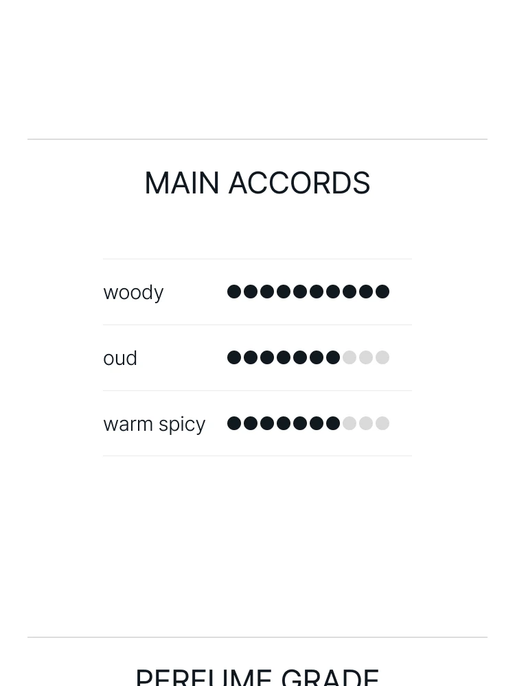 - 싱글 노트: 아가우드, 브라질리안 로즈우드, 샌달우드, 카다멈, 바닐라, 사천 페퍼, 베티버, 통카 빈, 앰버