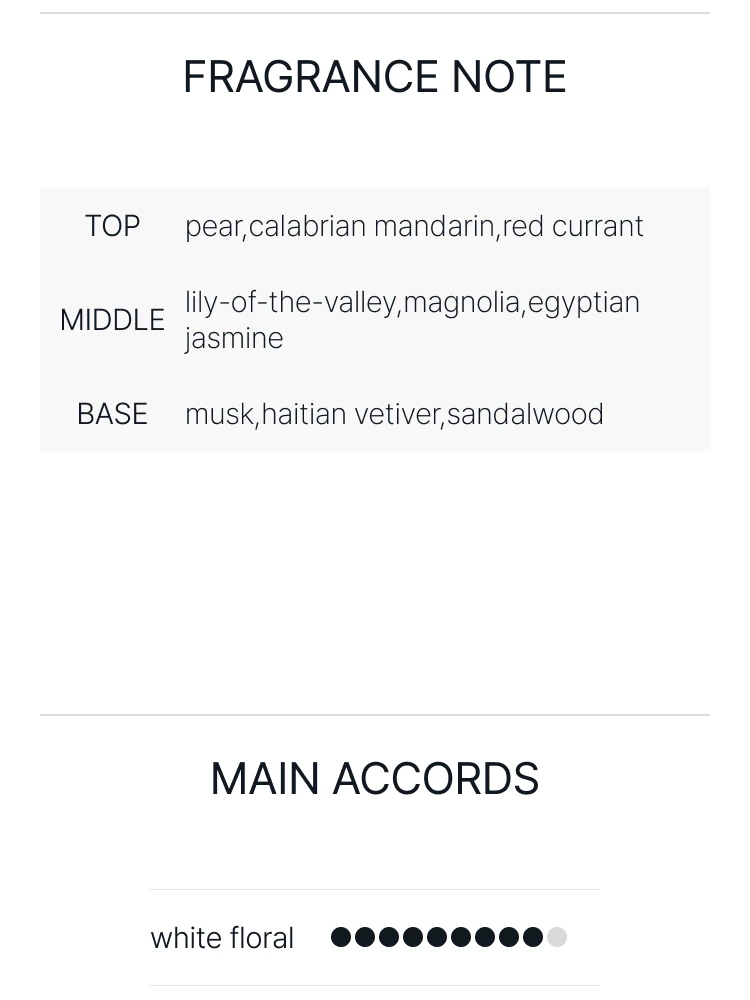 [부향률] - 오 드 뚜왈렛 [메인 어코드] - 화이트플로랄 / 프루티 / 시트러스 [메인 노트] - 탑 노트: 페어, 칼라브리언 만다린, 레드 커런트 - 미들 노트: 릴리 오브 더 밸리, 매그놀리아, 이집트 자스민 - 베이스 노트: 머스크, 베티버, 샌달우드 [향 설명] - 꽃잎의 살랑이는 자연의 바람의 내음