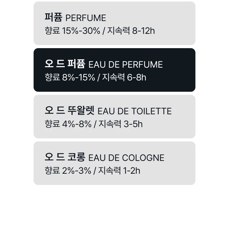 | 사용방법 | 맥박이 뛰는 부위나 실루엣 라인으로 뿌려줍니다. 여성용 향수이지만, 남성의 향수와 더해지면 새로운 제 3의 향을 만들어낼 수 있습니다. |