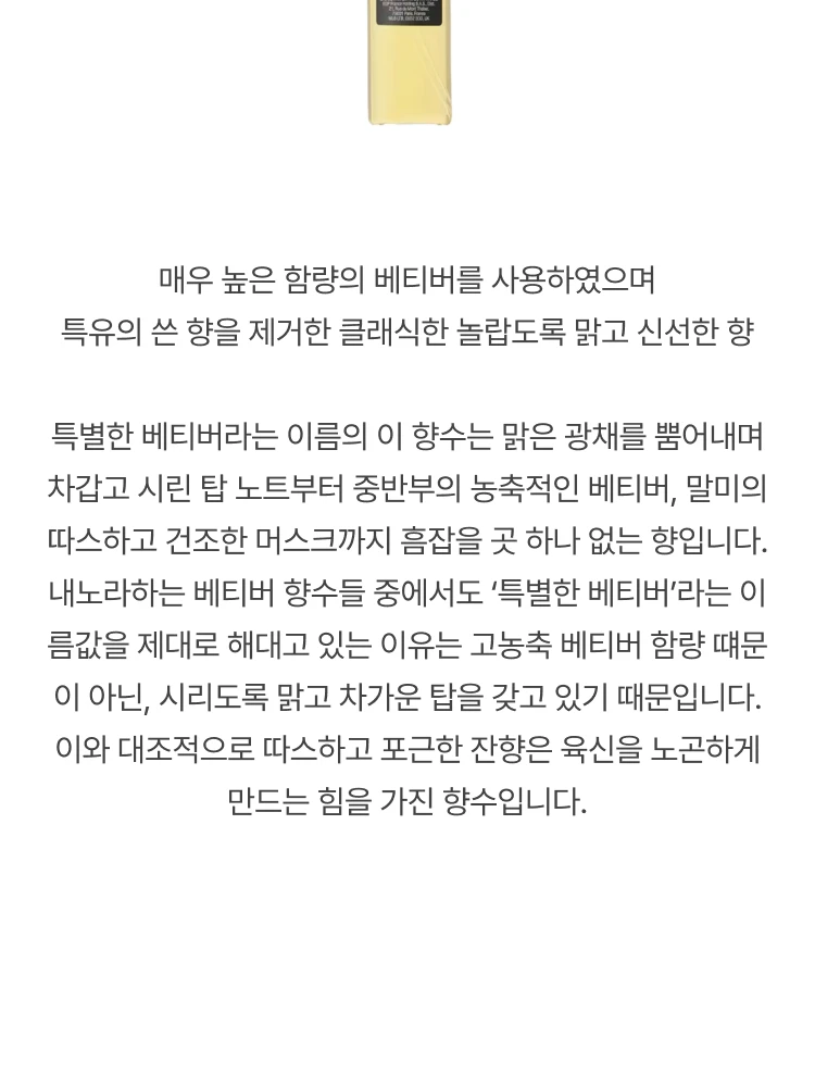 - 매우 높은 함량의 맑고 신선한 베티버 향