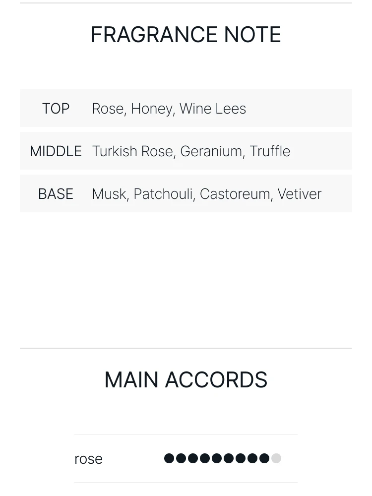 - 미들 노트: 터키쉬 로즈, 제라늄, 트러플