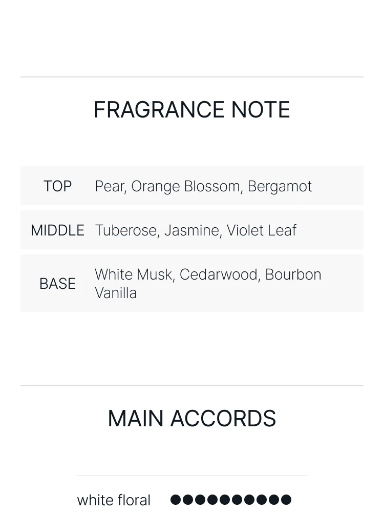 - 미들 노트: 튜베로즈, 자스민, 바이올렛 잎